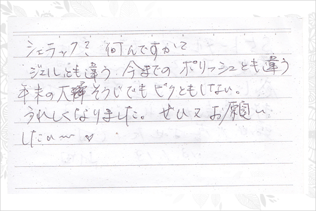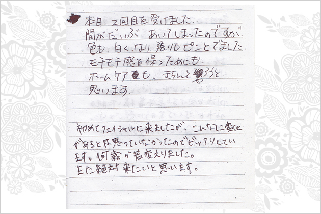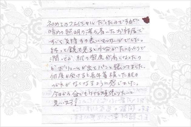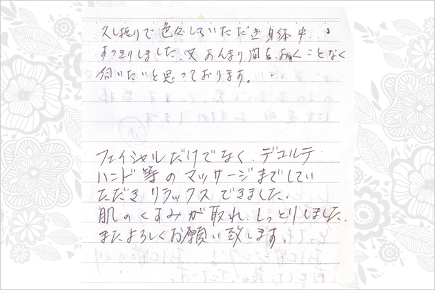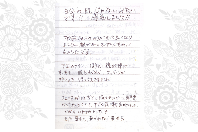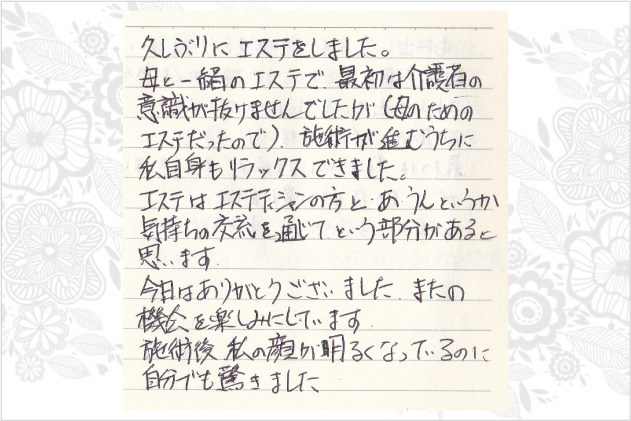 お客様お一人お一人の「お悩み解消と理想追求」と「エステティックの楽しさやその効果」を心を込めて丁寧な技術とおもてなしでご提供させていただいております。