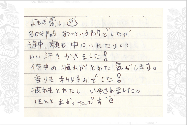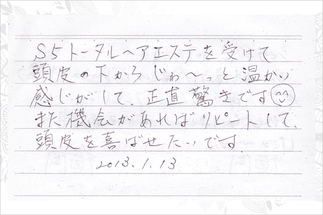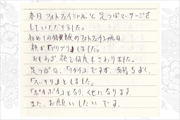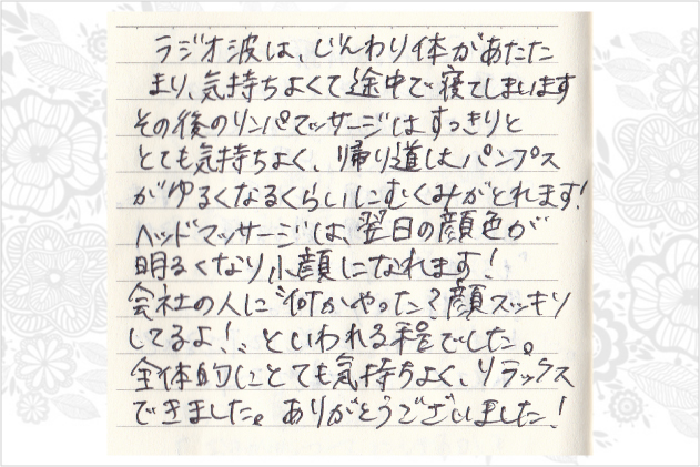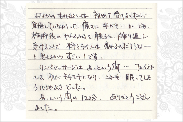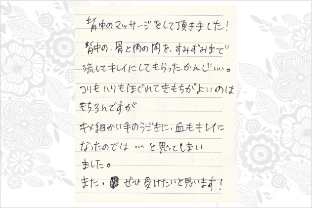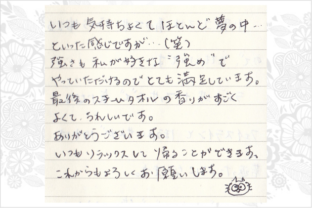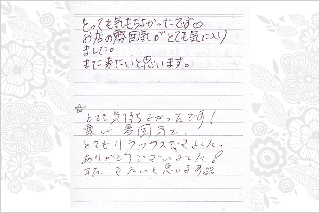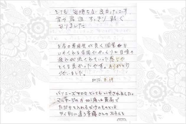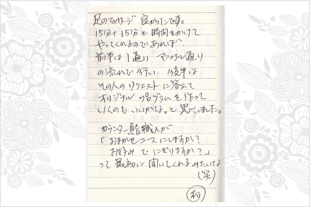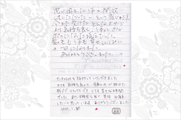 日常のストレスや疲れを解放し、自分のための癒しの時間を過ごしていただくことで明日へのエネルギーチャージのお手伝いができたらと考えます。